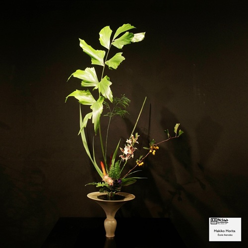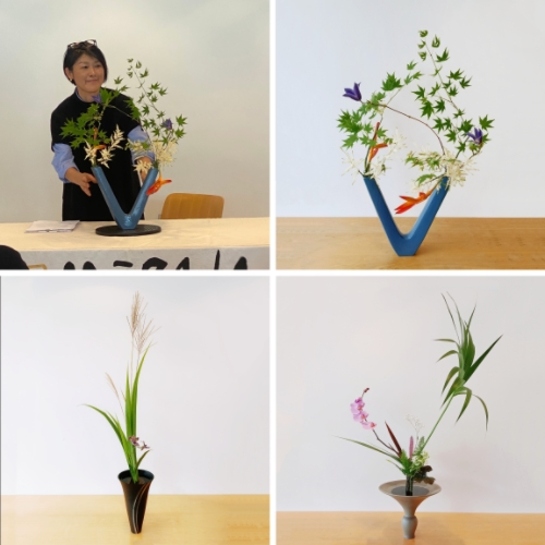 Les 3 professeurs des écoles Ikenobo, Ohara et Sogetsu enseignant à la MCJP ont chacune réalisé 3 compositions en direct devant l’assistance qui a fait salle comble.